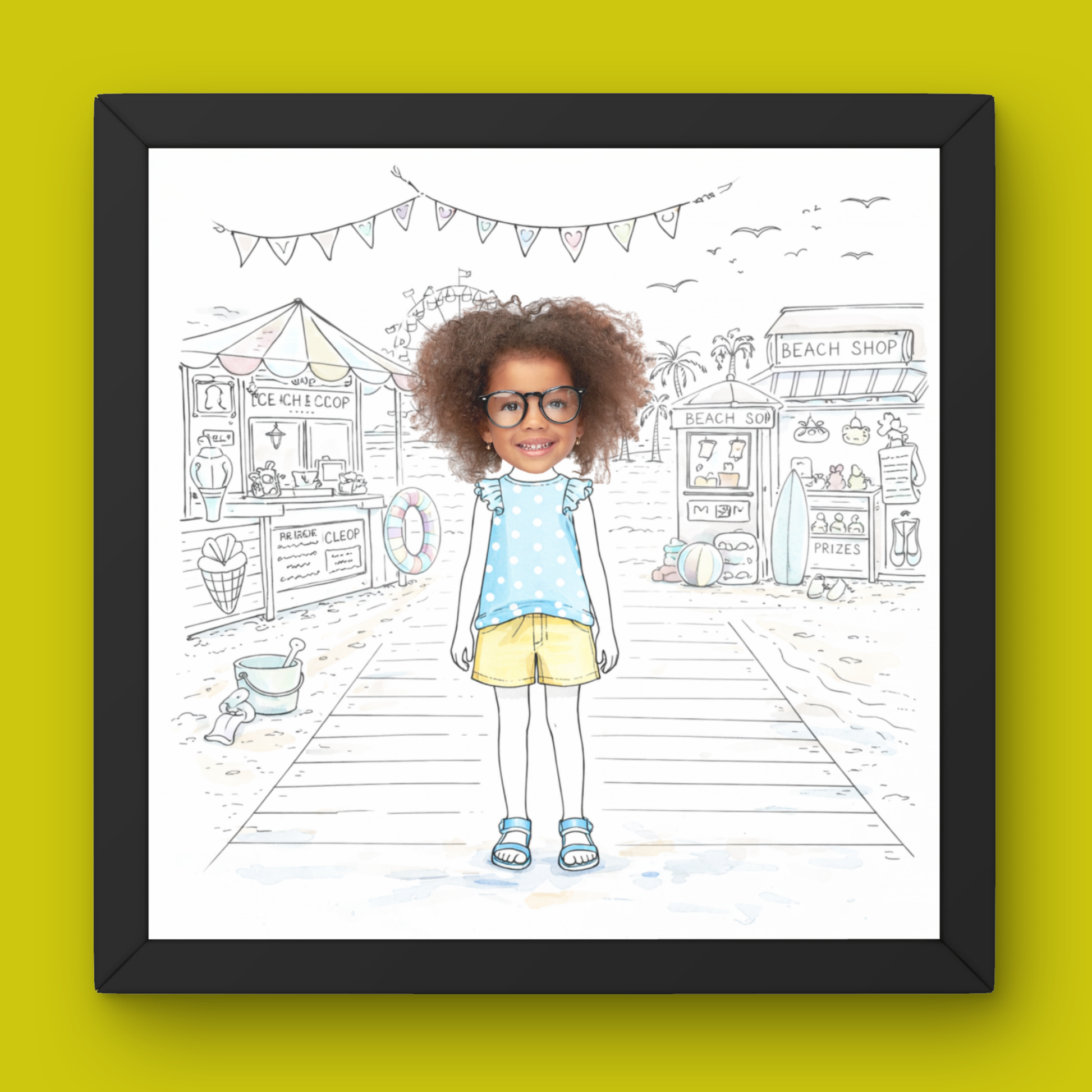 Capture the carefree magic of summer with this personalized beach boardwalk portrait. This whimsical, hand-drawn illustration features a charming coastal scene complete with beach shops, treats, and seaside details—brought to life with soft watercolor accents and clean, modern linework.