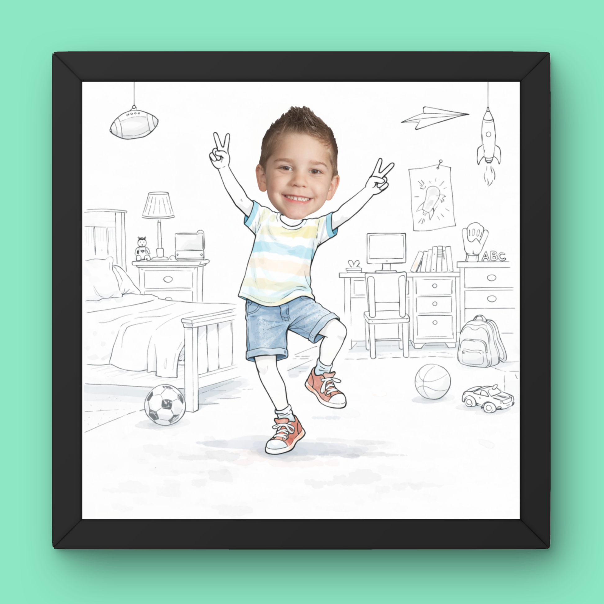 Turn your child into the star of their own playful bedroom scene with this custom illustrated portrait. This unique artwork features a fun, energetic kid design set in a cozy bedroom filled with imaginative details like sports gear, toys, and creative decor.