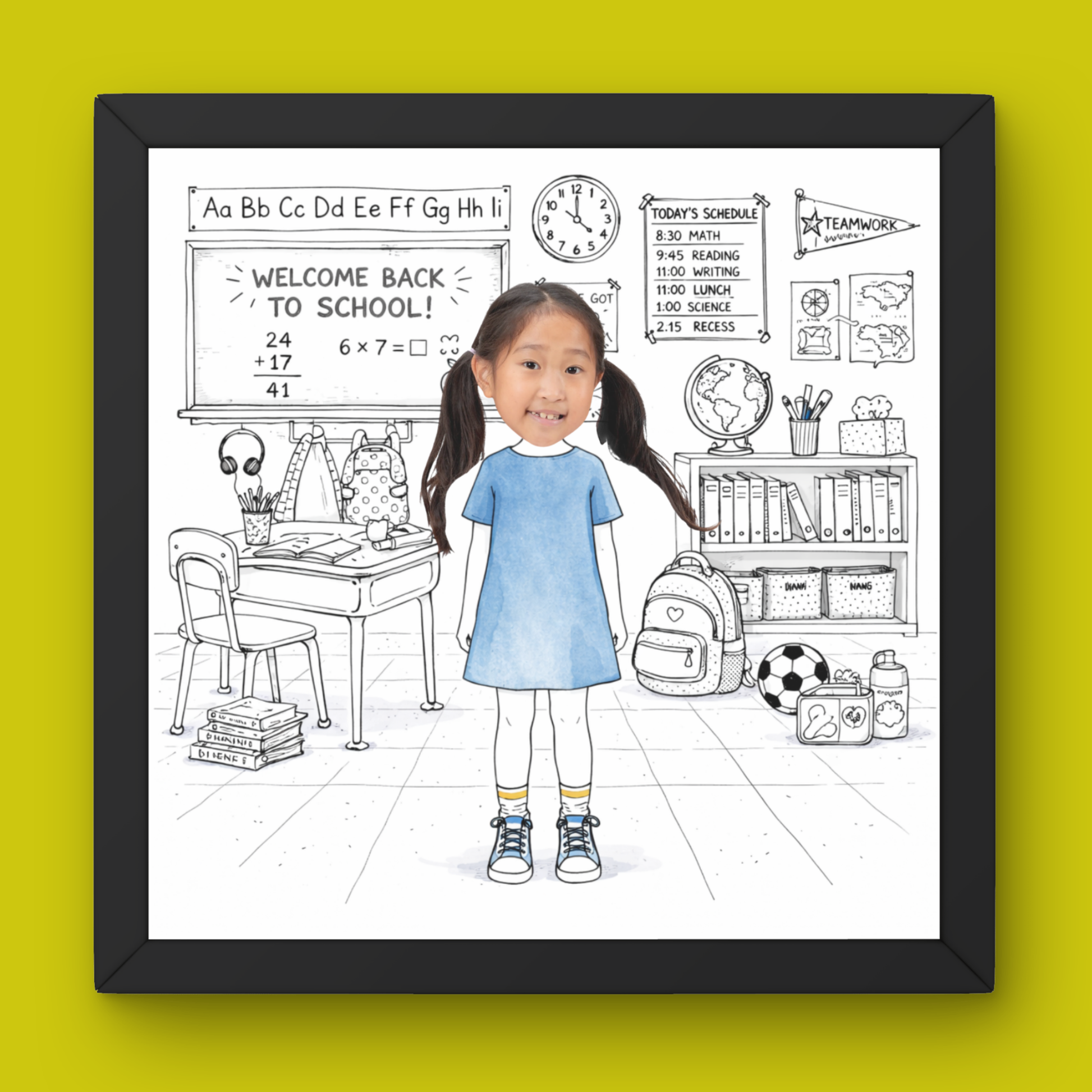 Celebrate the excitement of school days with this personalized classroom portrait illustration. This unique artwork features a charming, hand-drawn classroom scene with soft watercolor accents and a clean, modern style. Each piece is customized with your child’s real photo, making it a meaningful keepsake you’ll treasure for years.